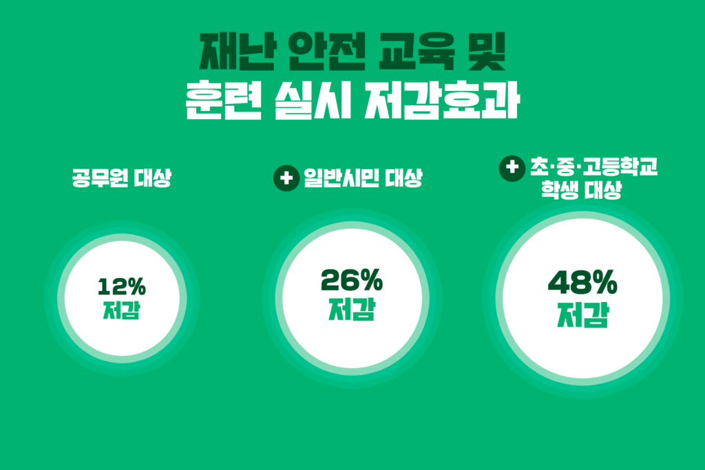 어린이 및 청소년의 재난 안전교육은 재난 발생 시 대응을 위함 보다는, ‘예방’이 목적입니다. 재난안전교육과 훈련을 공무원만을 대상으로 실시한 경우 약 12%의 위험도 저감효과가, 공무원과 일반시민들을 대상으로 실시할 경우 약 26% 정도의 저감효과를 예측할 수 있으며, 초·중·고등학교 학생들에게도 실시할 경우에는 약 48%의 위험도 저감효과를 기대하는 등(정건희, 2014) 재난 대비에 긍정적인 영향을 미친다는 것을 알 수 있습니다.
