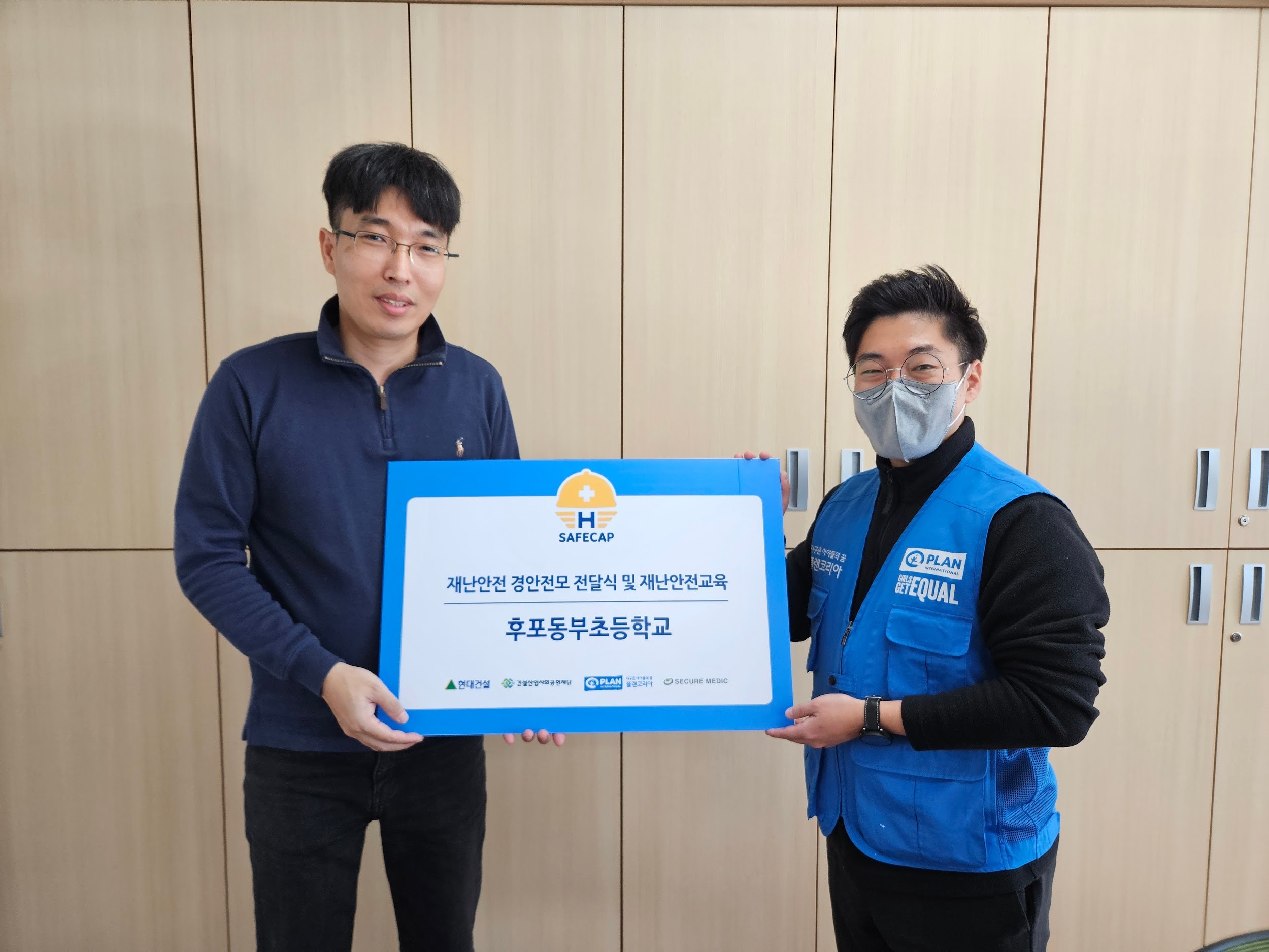 플랜코리아는 경북 지역 초등학교에 방문하여 재난안전 경안전모를 전달하고