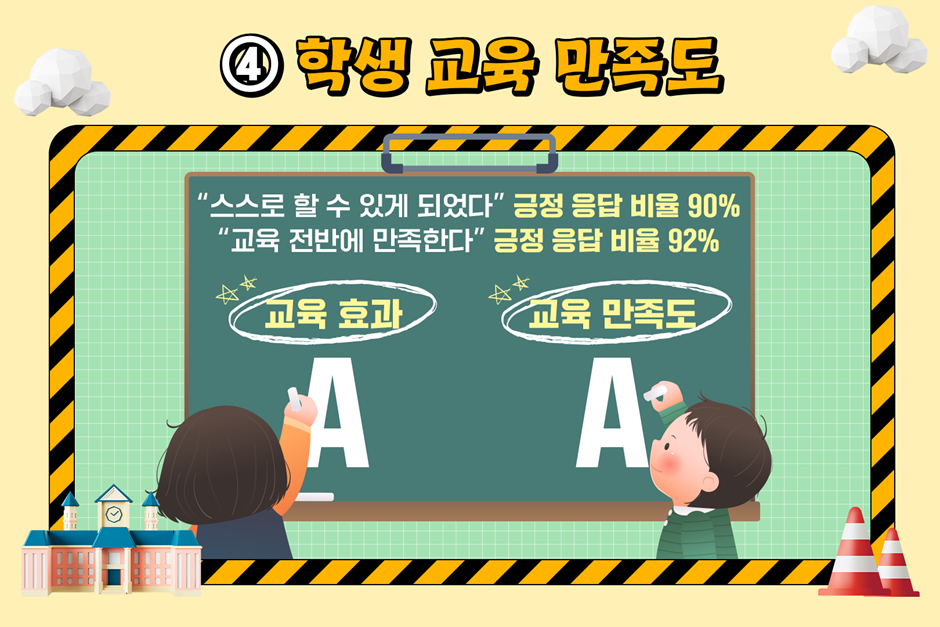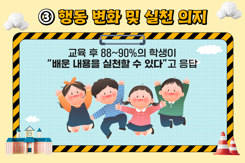교육 후 88~90% 학생이 “배운 내용을 실천할 수 있다”고 응답했는데요. 체험형 안전 교육을 통해 배움이 행동으로 이어질 준비가 되었다는 점이 인상적인 결과였습니다.