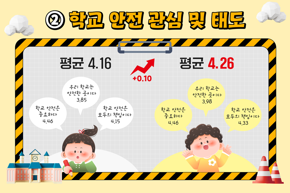 평균 점수 역시 4.16점에서 4.26점으로 상승했습니다. 안전이 ‘어른들이 알아서 하는 일’이 아니라 모두가 함께 지켜야 할 약속이라는 인식이 자리 잡기 시작한 모습이었습니다.